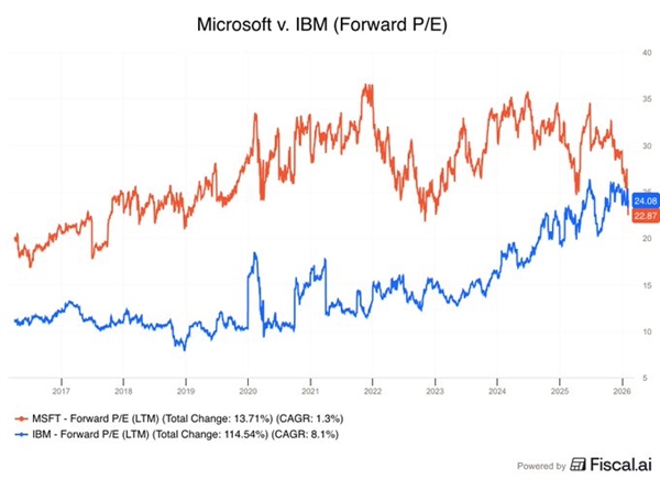 而很明显,按照FactSet的遍及预期,微软目前的股价其实曾经比IBM还要“廉价”两者的远期市盈率目前别离为23.0倍和23.7倍。估计微软将成为2026财年独一实现现金流跨越本钱收入的超大规模云办事商。虽然微软评级被Melius Research下调,Reitzes还表达了对人工智能能否会带来报答的担心。